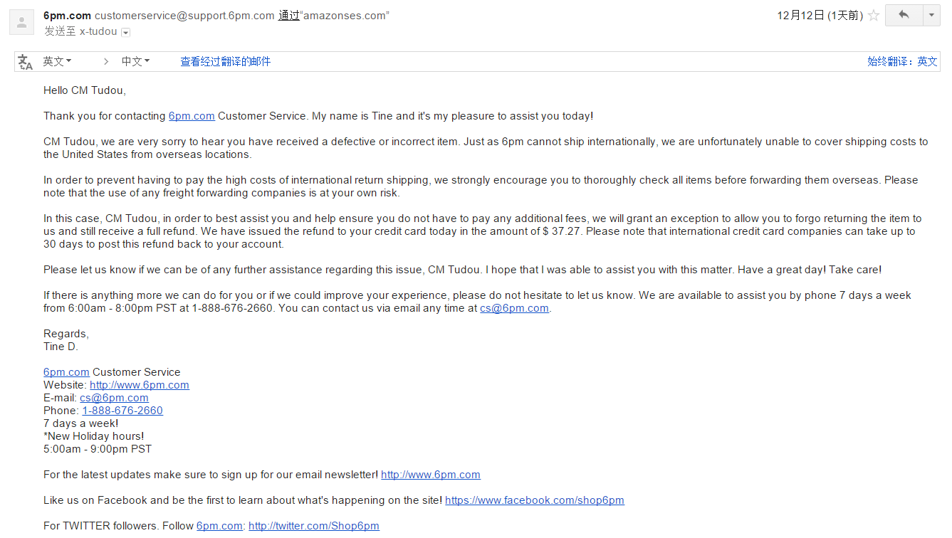 接上篇,在6PM买到了一双尺码不同的奇葩鞋子,不知所措,去论坛发帖求助,很多人表示233,也有说可以免单的,建议联系客服。