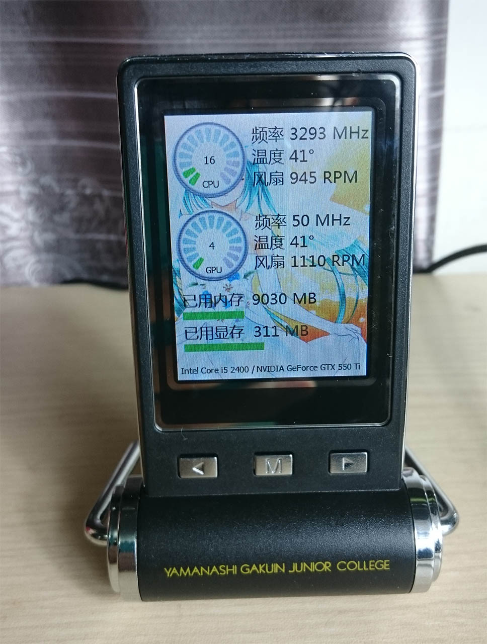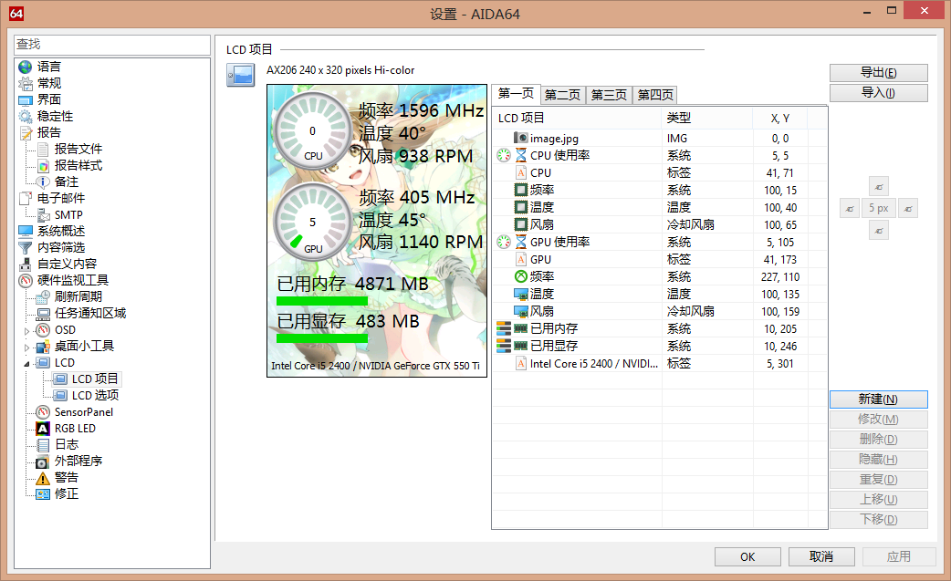 然后就可以打开 Aida64 配置了,在 设置 的 LCD 项里面启用 AX206 LCD 支持就可以了,接着就调整要输出的信息,还可以自定义背景图片,这个也很简单就是要稍微花点时间,只有在运行着 Aida64 的情况下才有信号输出,所以要把 Aida64 设置为开机启动。