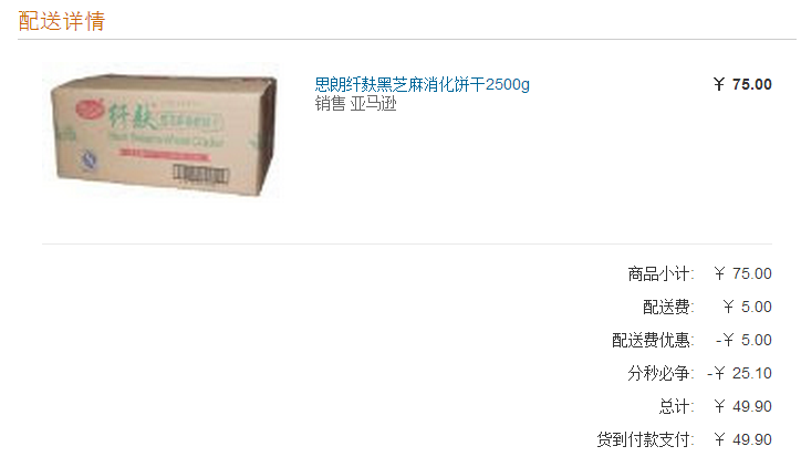 日常 被Amazon坑了五块 Z秒杀买到的饼干。 下单后没注意看,以为优惠25块。 后来一细看竟然有5块配送费。 然后查了下,买表竟然涨价了,以前好像35免运费来着。 如果注意看的话再买五块钱东西就免运费了,坑爹啊!!!