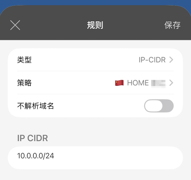 最后在配置文件的“规则”里添加一条规则,类型选 IP- CIDR ,策略选家里的 VMESS 节点,IP CIDR填 10.0.0.0/24 。