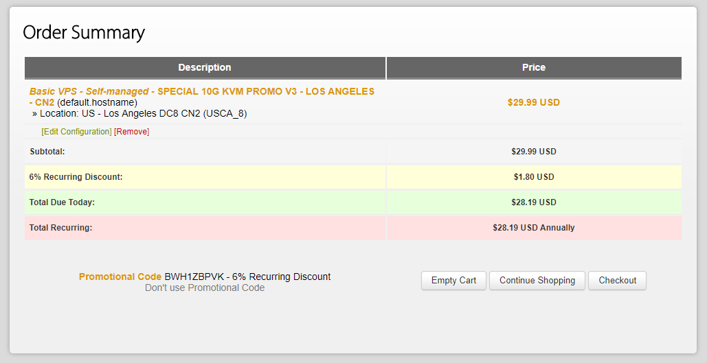 SPECIAL 10G KVM PROMO V3 - LOS ANGELES - CN2 SSD: 10 GB RAID-10 RAM: 512 MB CPU: 1x Intel Xeon Transfer: 500 GB/mo Link speed: 1 Gigabit