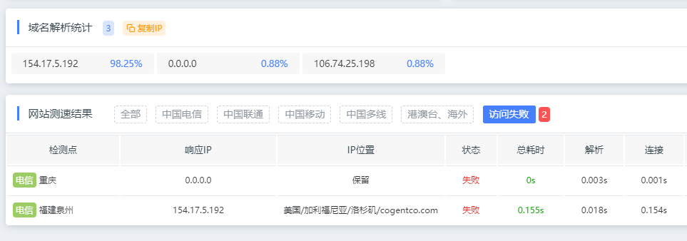 用 ITDOG 的测试看了下,只有重庆的运营商 DNS 解析错误,泉州无法访问是防火墙白名单的原因。