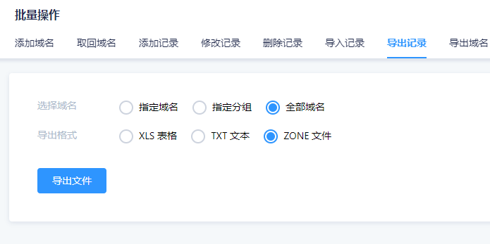 由于 DNS 记录很多,还需要从 DNSPOD 导出域名记录,导出格式选 ZONE 文件,就可以把 DNS 记录都导入 CF 了。