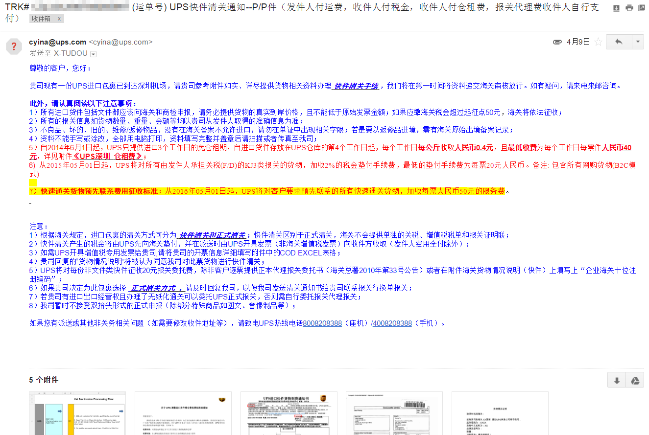 卖家在 4 月 5 号发货,9 号快件就到达深圳准备清关,于是我收到 UPS 的邮件。
