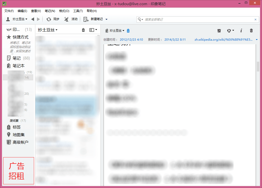 折腾 Evernote在颤抖 更新到了5.2.1.3108后,打开设置界面突然看到了取消广告的选项。 看来Onenote免费的消息对大象打击很大,何时提升免费用户的流量? 原来广告的位置,其实一直是自家应用的广告,无伤大雅。
