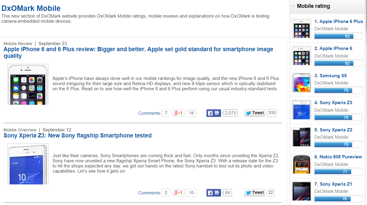 英语不好没关系,进入DxOMark Mobile的右侧就有个手机相机的排行榜,还显示评分,非常直观。(妈蛋SONY的2000W像素G镜头竟然干不过Apple的祖传800W!)