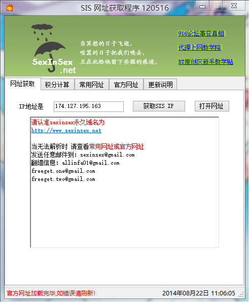 来源:SIS 网址获取程序+积分计算+常用网址+官方网址 0516更新