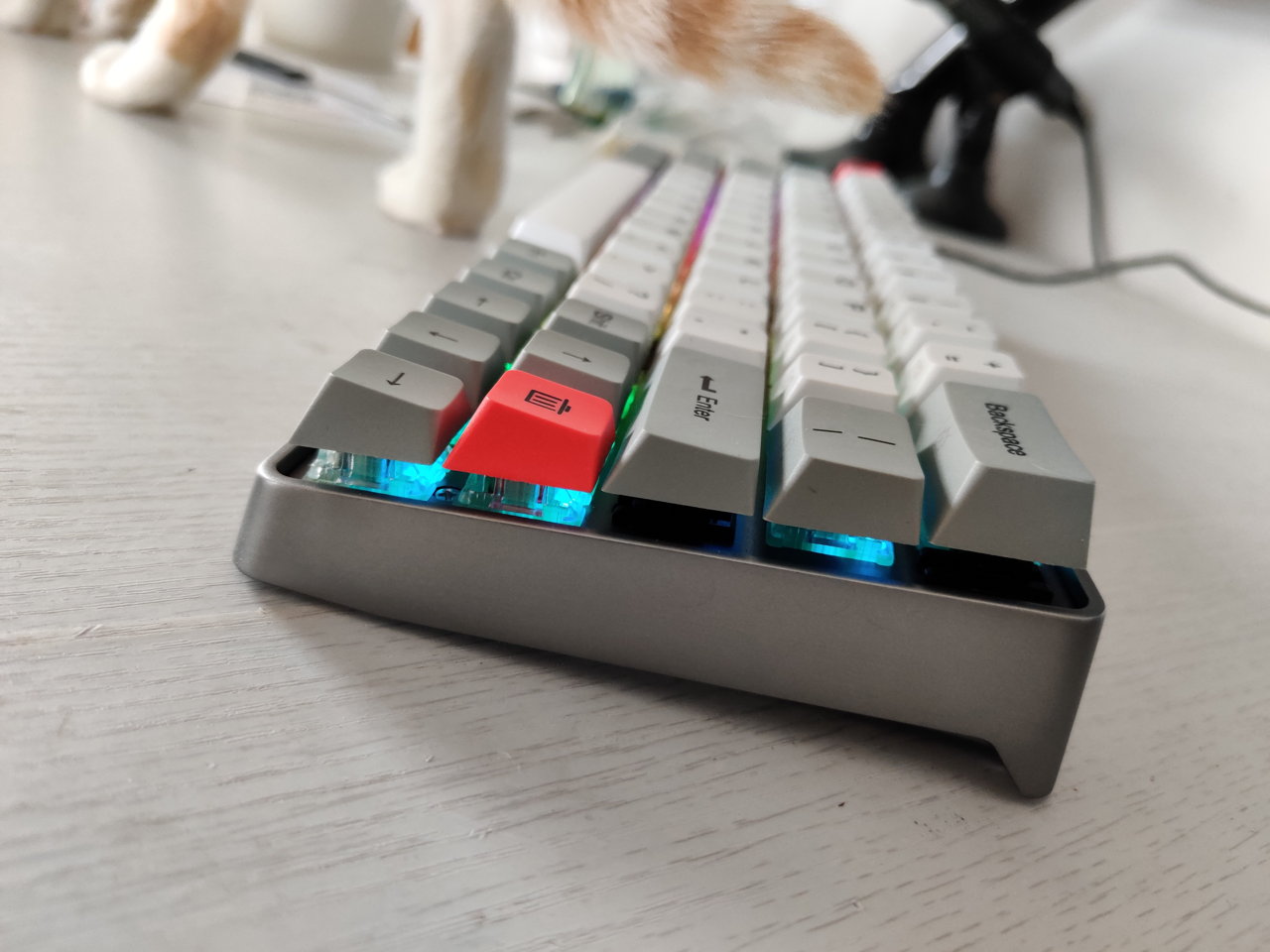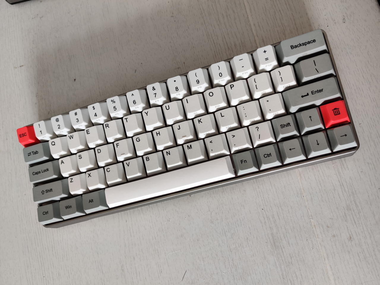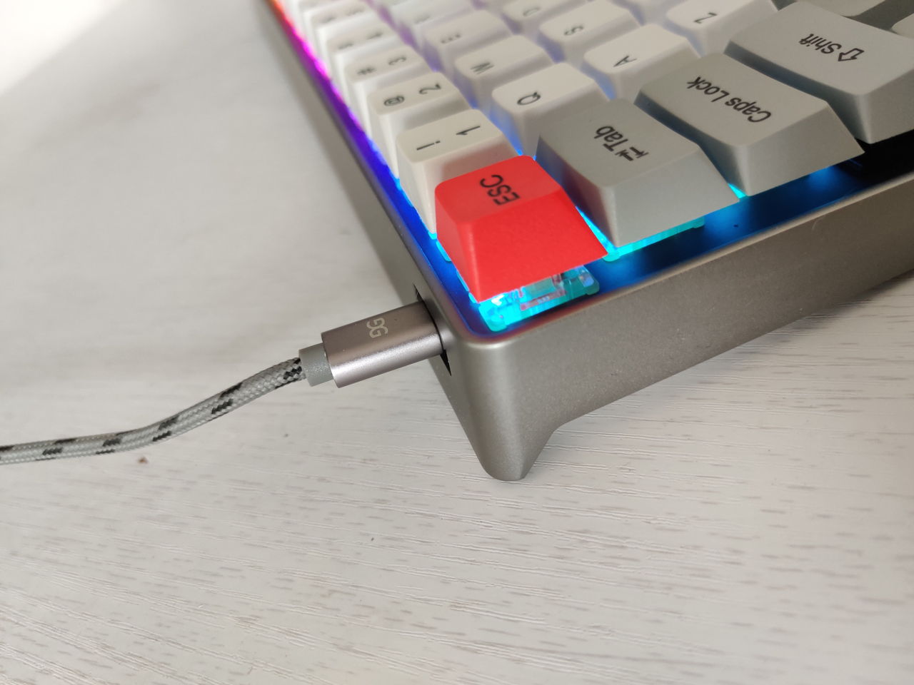 阳极氧化铝的外壳,复古色的键帽,樱桃 RGB 红轴, USB Type-C 接口,有支持蓝牙的 PCB 板出售,以后想改无线键盘也行。支持热插拔换轴,可以换樱桃、凯华、佳达隆等轴体。