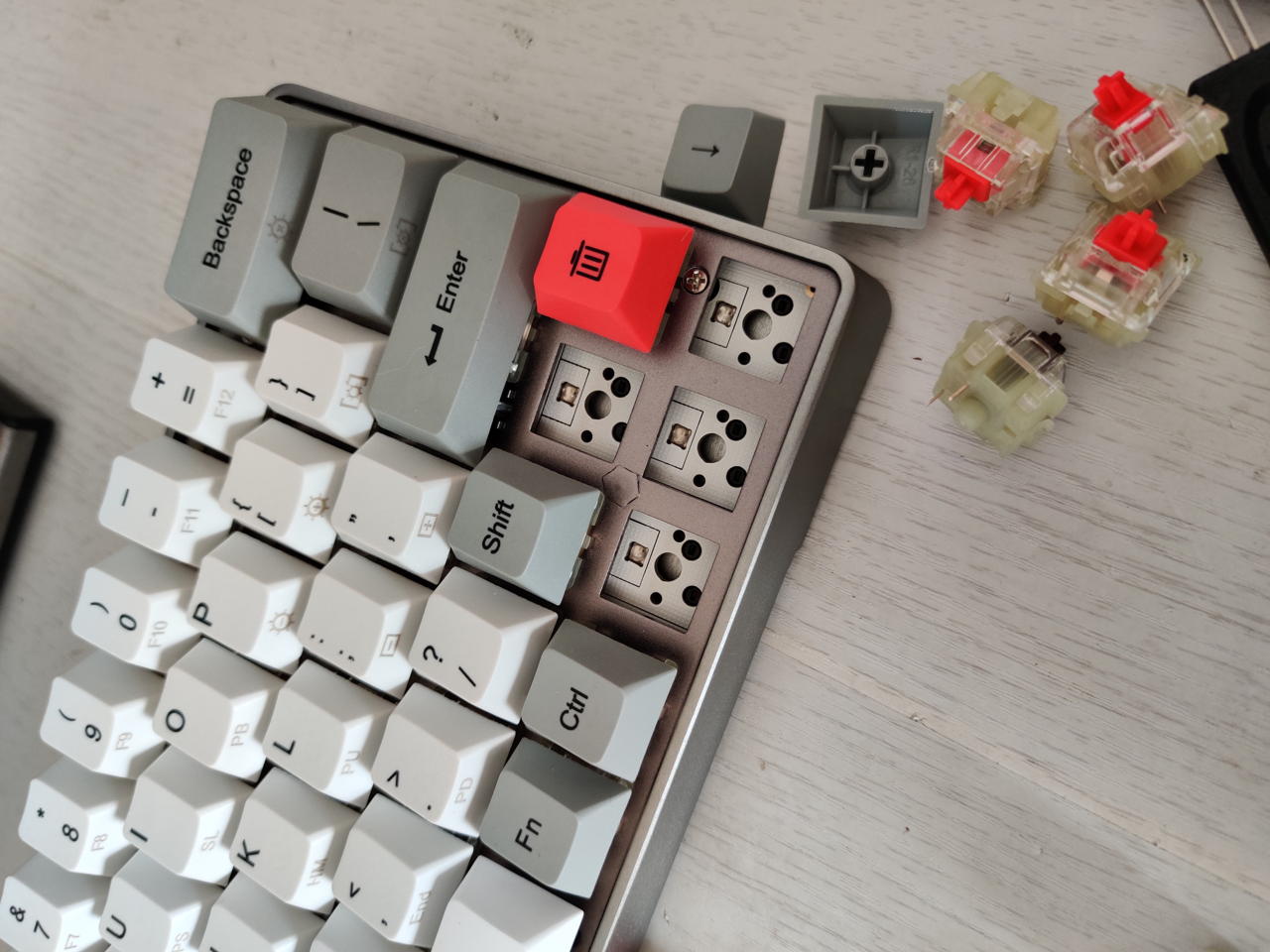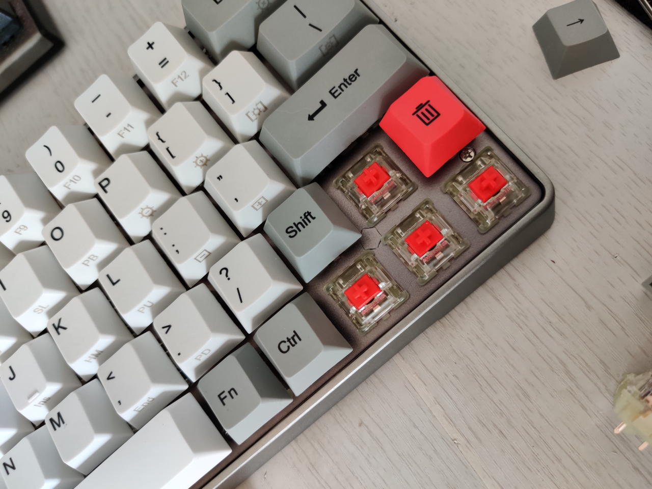 本键盘一大亮点,热插拔换轴,送了拔轴器可以轻松把机械轴拔出来,反倒是键帽比较难拔。