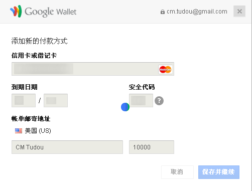 然后去Google Wallet添加信用卡或者在Google Play上添加也可以,填上虚拟信用卡信息。