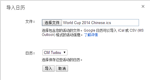选择刚才下载World Cup 2014 Chinese.ics,导入。