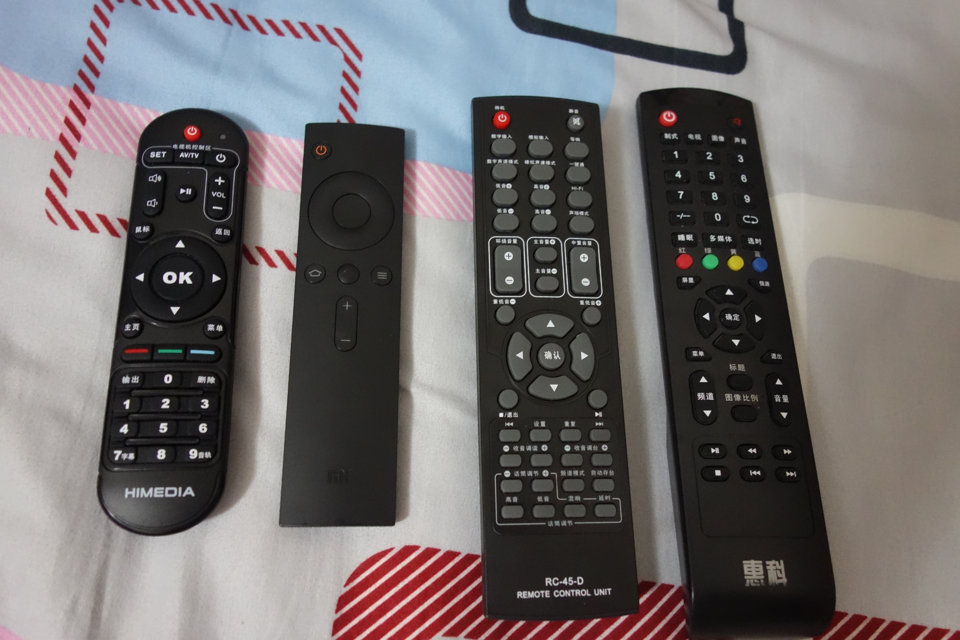 海美迪 H7 的遥控器密密麻麻的很多按键,小米的简洁很多,另外一个是功放机一个是电视机的遥控。