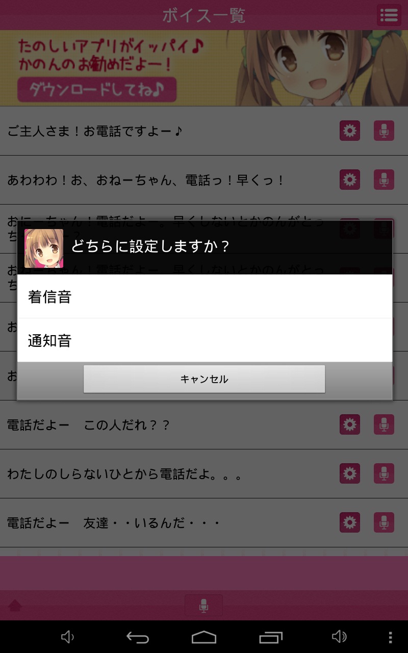 ACG 折腾 萌妹纸铃声APP ~ 無料♪ かのんの着ボイス♪ 无意中在Google Play上发现的 ~ 声音超萌啊!O(≧∇≦)O https://baka.li/wp-content/uploads/2014/01/あわわわ!お、おねーちゃん、電話っ!早くっ!.mp3 https://baka.li/wp-content/uploads/2014/01/おにーちゃん、電話だよ~.mp3 https://baka.li/wp-content/uploads/2014/01/おにーちゃんに お知らせがあります!.mp3 https://baka.li/wp-content/uploads/2014/01/ご主人さま!お電話ですよー♪.mp3 https://baka.li/wp-content/uploads/2014/01/約束の刻がきた!今こそ契約をはたすのじゃー!.mp3 https://baka.li/wp-content/uploads/2014/01/早く取らないと切れちゃうよー.mp3 拥有70多个铃声。 可以设置为着信音(电话铃声)或者通知音(短信和Mail)。 下载地址: 無料♪ かのんの着ボイス♪ (Google Play) 無料♪ かのんの着ボイス♪ (百度云) 無料♪ かのんの着ボイス♪ 铃声提取