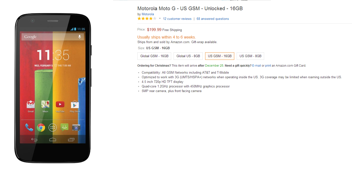 MOTO出品,高通晓龙400四核(MSM8226Q),4.5寸720P的IPS屏,8GB版本价值只要179刀,折合RMB1100块。