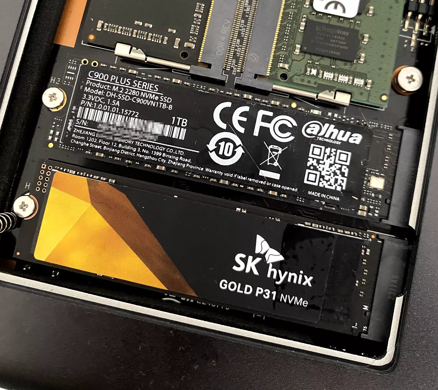 镜像同步完成后再替换上另一块 1TB 的 SSD,这块大华 C900 PLUS 是我电脑上拆下的,无缓盘,PDD 200元的历史低点购入,据说容易掉盘,所以搭配上了一块以可靠性著称的 P31 。
