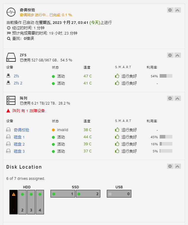 添加完硬盘后开始进行奇偶校验,以前校验的速度只有 100MB/s 出头,因为速度受限于最慢的那块西数 2TB 紫盘,当校验超过 2TB 后,速度开始达到 200MB/s ,不过最后校验完还是花了 18 小时。