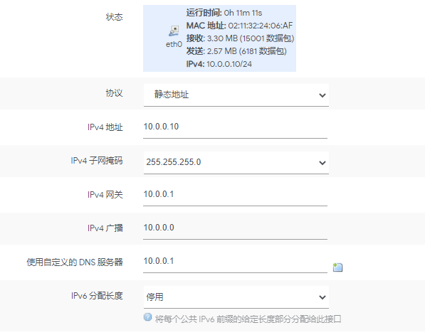 虚拟机旁路由 IP 是 10.0.0.10 , LAN 口的设置如下: