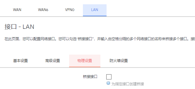 LAN 口的物理设置里的“桥接接口”还要去掉勾,点击保存。