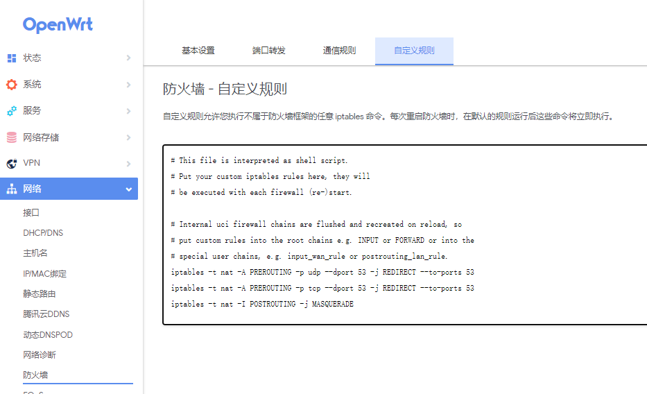 再在防火墙的自定义规则里添加一段规则,然后重启防火墙和应用设置。