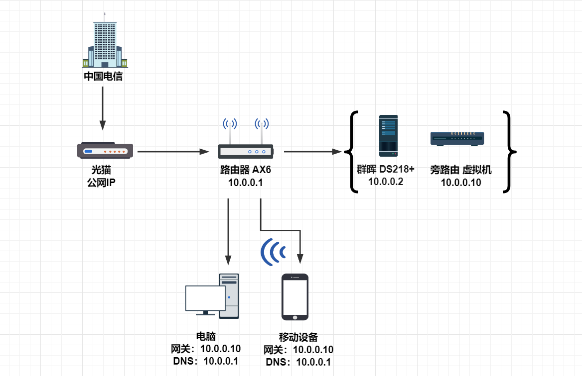 先看下网络拓扑图,光猫改桥接模式,使用主路由红米 AX6 进行拨号、DHCP分发,旁路由只负责翻墙。