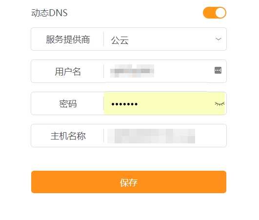 注册成功后,进入路由器的 [动态DNS] 设置,填写自己的 DDNS 服务提供商,比如我上面注册的公云。