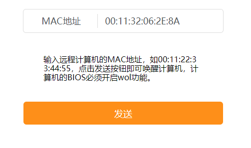 找到真正的 MAC 地址后,就可以进路由器 Web 界面设置的网络唤醒里,填上 MAC地址并发送就能成功唤醒黑群晖 NAS 了。