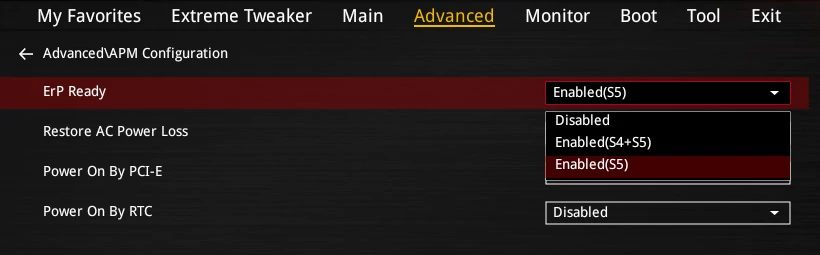 如果 BIOS 开启了 ErP Ready,请关闭,改成 Disabled 。