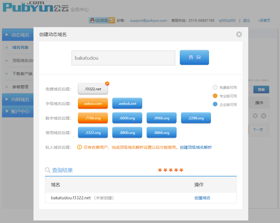 我用的是公云的 DDNS 服务,打开他们的网站 pubyun.com , 注册一个账号,然后登陆进控制面板,点击 [动态域名] – [创建动态域名] ,输入自己想要的动态域名并注册。