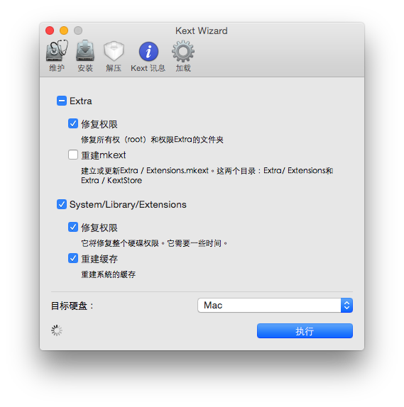 然后我用Kext Wizard修改权限,重建缓存,执行然后重启。