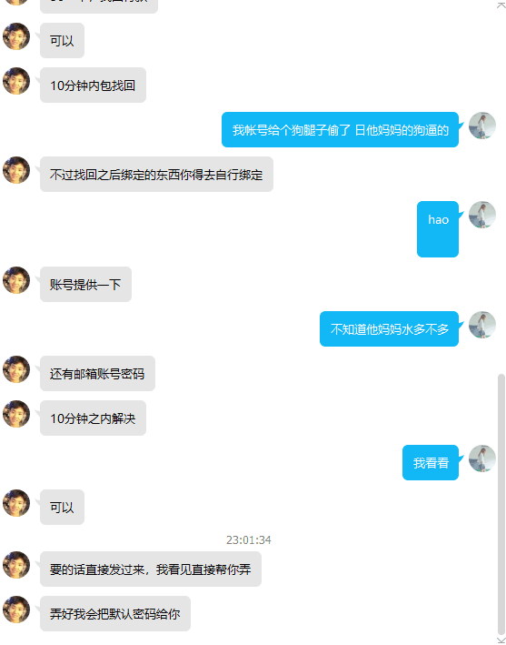 - 伪造聊天记录表示自己在贴吧看到的黑客很厉害,能找回帐号密码,忽悠卖家去联系黑客找回密码。