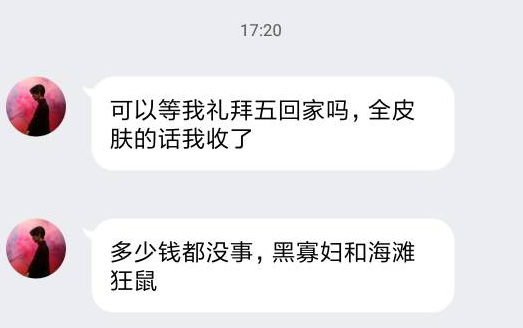 然后朋友表示号被盗了,暂时卖不了,等明天。骗子B表示很急,希望晚上就能上号开黑。