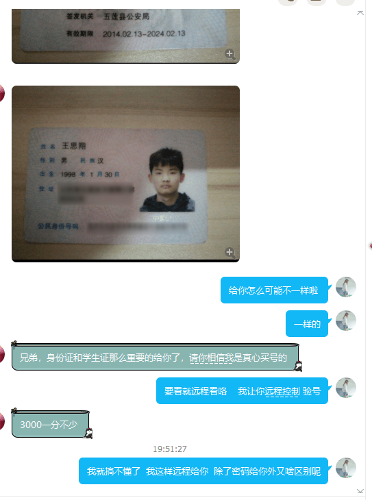然后把不知道哪里搞来的身份证图片发来,表示自己很有诚意。还提出要先款交易,给帐号密码就支付宝打钱。