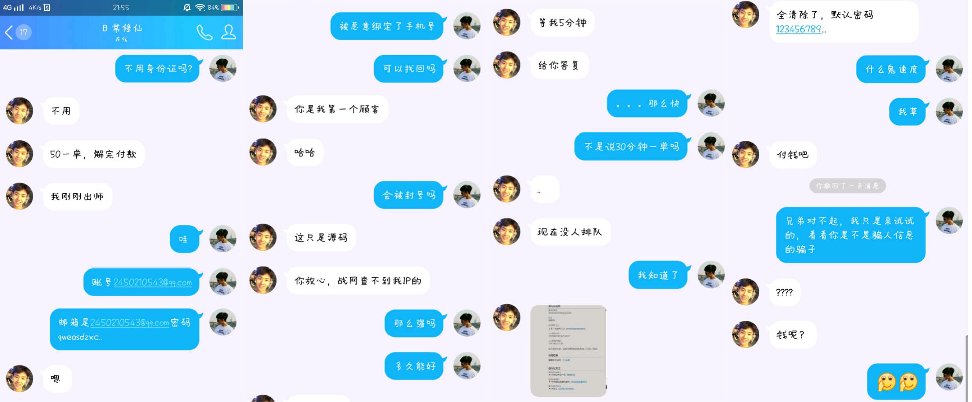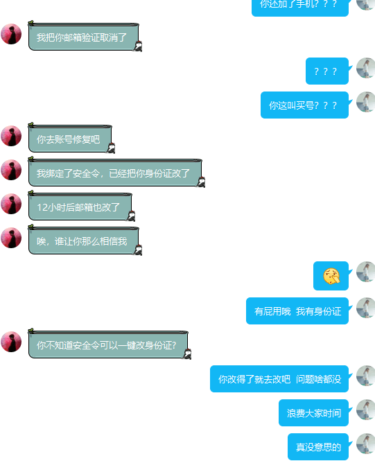 如果给了资料,你的帐号就完了,就这样,套路很简单,但是其中用到了三个身份,四个Q号,两个贴吧帐号一个微信帐号,绝对能把萌新骗的团团转。