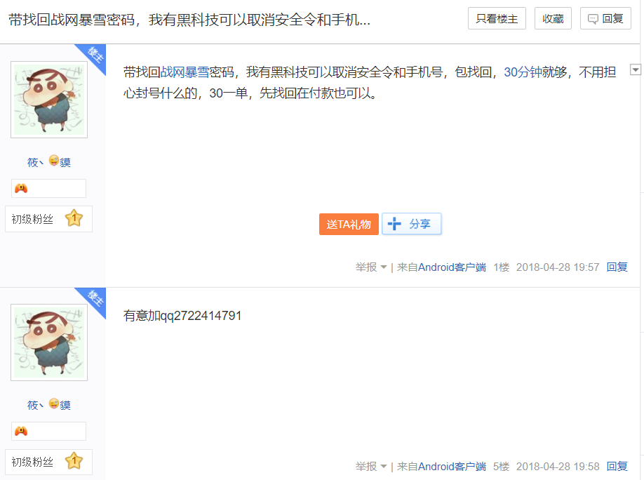 骗子B表示在贴吧看到有人发帖说可以找回暴雪战网账号的密码。