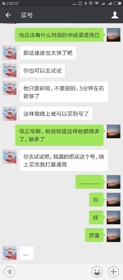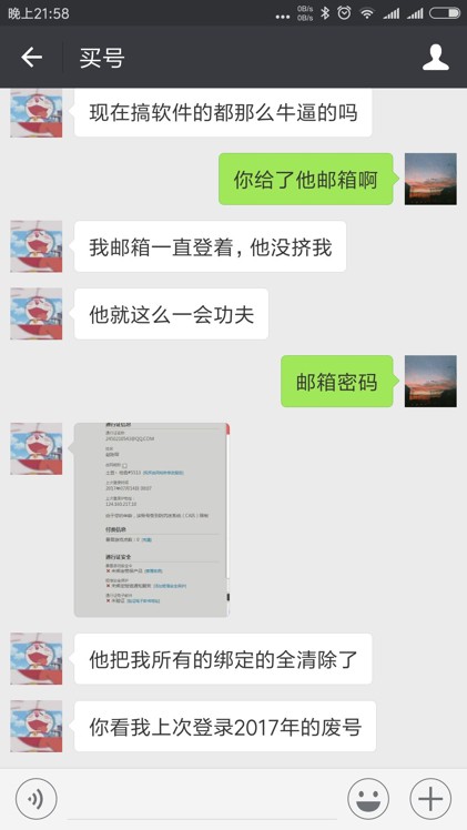 在获得朋友帐号密码后,为了骗取帐号所绑定的邮箱密码,骗子开始用微信假装另一个人买号。