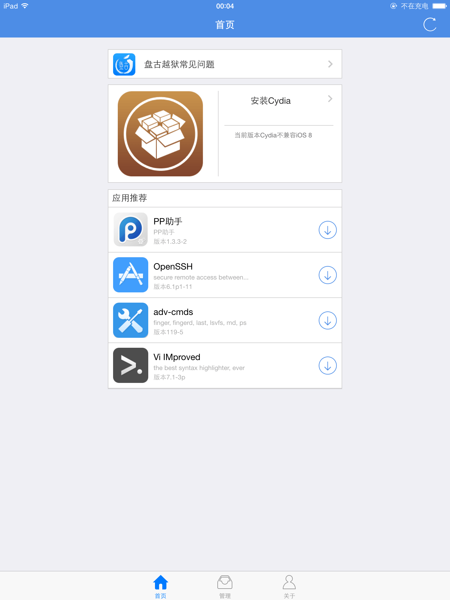 由于iOS8系统的诸多改变,Cydia以及依赖Substrate框架的许多插件都无法在iOS8下使用。因此我们在1.0版本的越狱中提供了开发者所需要的一些基础环境及SSH等插件,方便Cydia作者及其他开发者能尽快针对iOS8修改他们的代码。当Cydia作者完成兼容后,我们会发布更新来集成Cydia。所以,盘古越狱(iOS8)的1.0版本严格来说是为越狱开发者准备的版本。