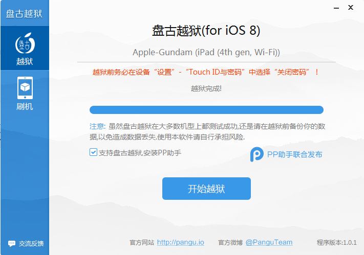然而在上线不久,越狱工具因部分用户出现应用、相册数据丢失等问题而被紧急撤下。经过修复后,盘古重新上线了该越狱工具1.0.1版本。