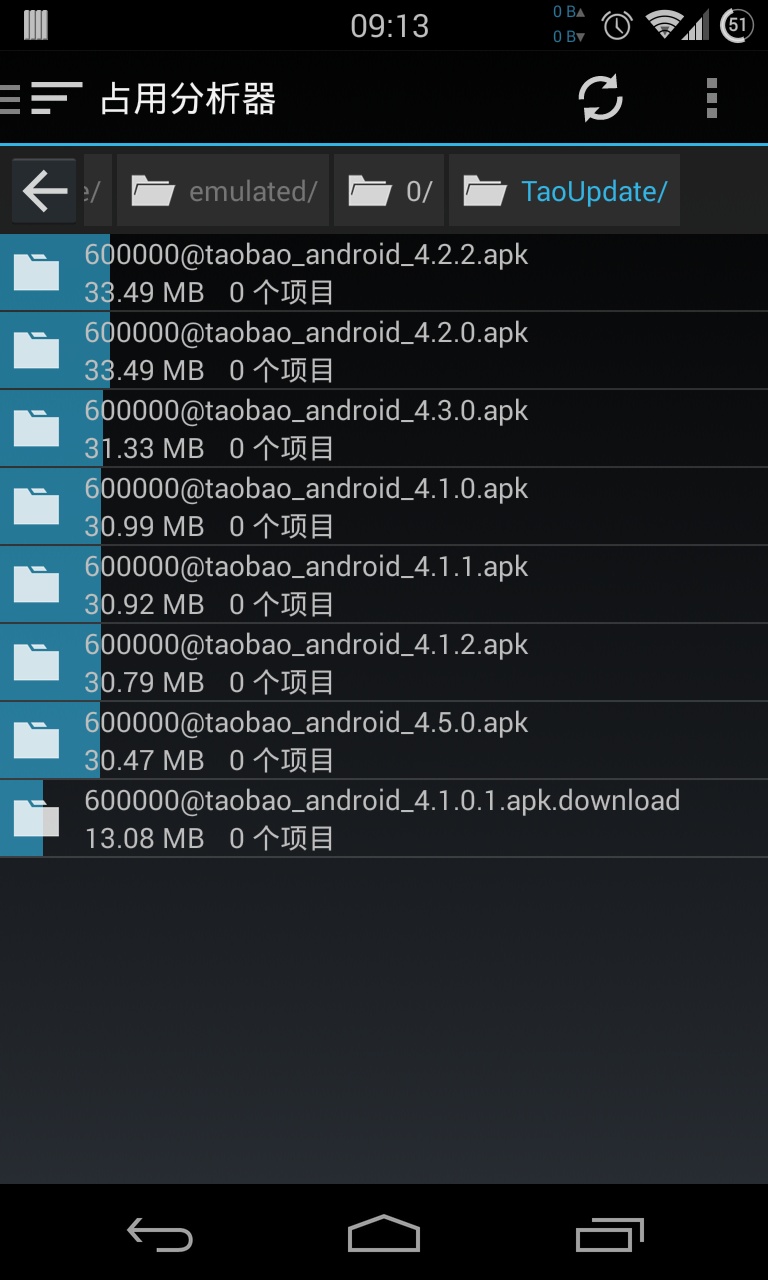 折腾 清理手机储存时吓一跳 Nexus 4只有16GB储存,除了系统巴拉巴拉就剩不到10GB的储存空间。 无损音乐占了快7GB,要拉一些新歌进去,逼的没办法只能清理下手机了。 用SD女仆的占用分析器发现一个叫 TaoUpdate 的可疑文件夹,占用了230MB的空间。 点开一看全是淘宝Android客户端的APK文件。 尼玛30MB一个客户端,每次升级都留下一个APK,要是再过几年不清理手机岂不是只放你家客户端的APK了? 没见过这么二的,当然,看Taobao的Android客户端水平,也就这么二了。