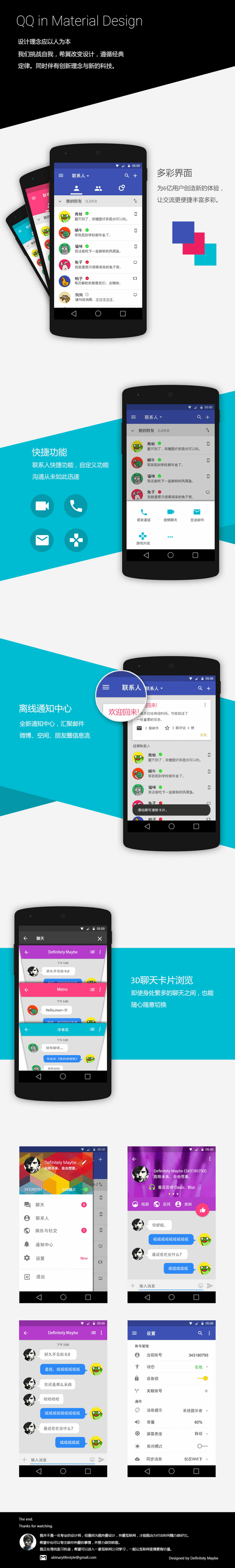 软件 QQ in Material Design by Definitely Maybe 接上期关于Android版QQ的UI。 知乎用户Definitely Maybe设计的Material Design版QQ,仅供观赏。 目测5年内我们就能用上Material Design的Android QQ了! 来源:如何评价手机 QQ 安卓平台 5.0 版?