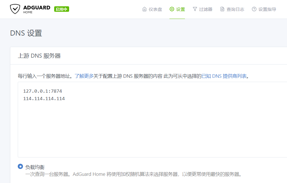 AdGuard Home 设置 – DNS 设置 – 上游 DNS 服务器 填写 OpenClash 的 DNS 地址 127.0.0.1:7874 和 114.114.114.114 ,填 114 DNS 是为了防止 OpenClash 关闭时能正常访问国内网站。