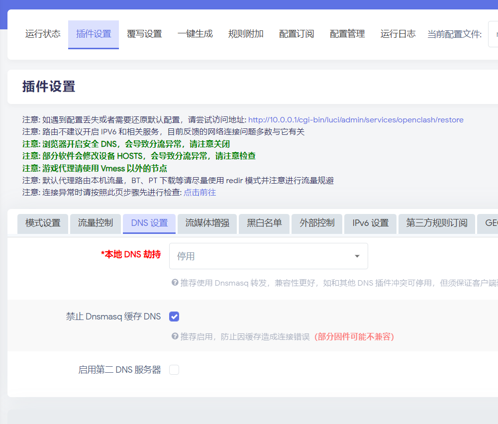 OpenClash 运行模式使用 Redir-Host (兼容) 模式 。把 OpenClash 界面的 插件设置 – DNS 设置 选项的 本地 DNS 劫持 给停用。