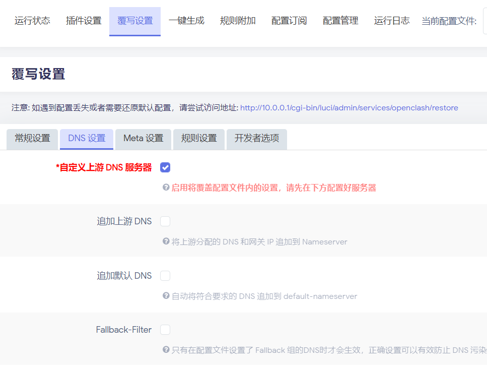 接着把 覆写设置 – DNS 设置 的 *自定义上游 DNS 服务器 给勾选,下面的上游 DNS 服务器用默认的配置就行。