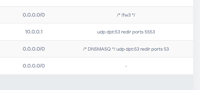 配置完成后在 OpneWrt 的防火墙里面,可以看到 udp dpt:53 redir ports 5553 这条规则是在 /* DNSMASQ */ udp dpt:53 redir ports 53 下面的。
