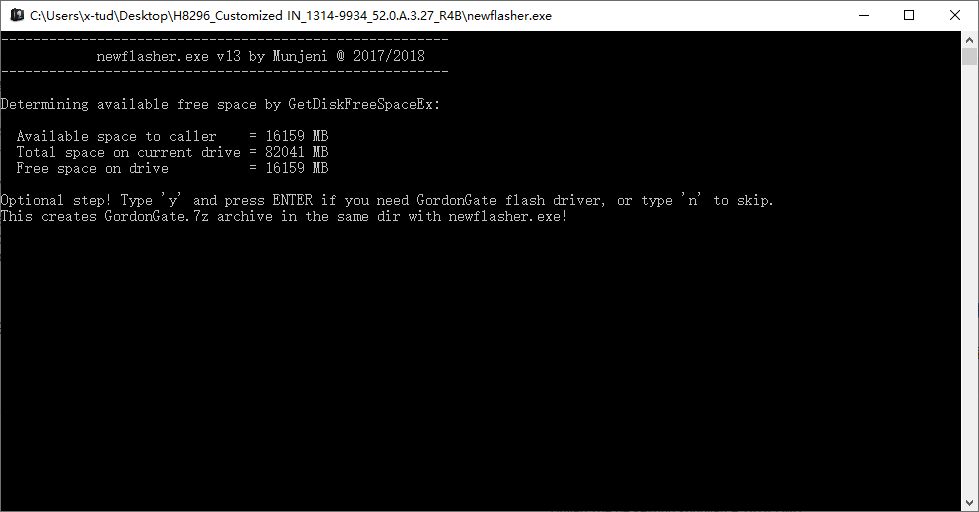 然后打开 newflasher.exe ,如果没有 Fastboot 驱动就输入 y ,会自动下载 GordonGate.7z ,解压安装这个驱动,然后会再次询问,再输入 n 无视,就开始刷机了,刷完有提示就可以拔出数据线开机了。