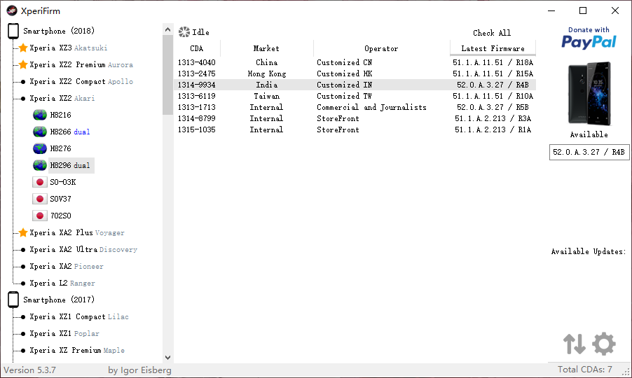 先打开 XperiFirm ,国行双卡版的 XZ2 选择 H8296 这个型号,52 数字开头的就是 Android 9.0 的固件,目前只有印度的,就下载它吧。
