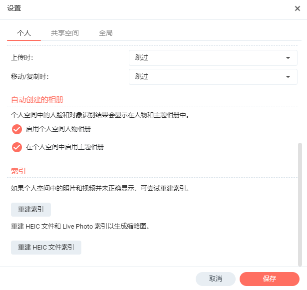 重新启动 Synology Photos 后进设置勾选 ”在个人空间中启动主题相册“ ,再重建索引就行。
