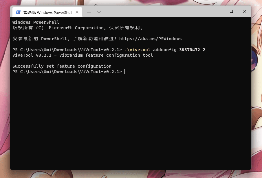 在 Github 下载 ViveTool 工具,解压,在软件目录右键选择 ”在终端中打开“ ,然后在命令行输入下面的命令重启就行。