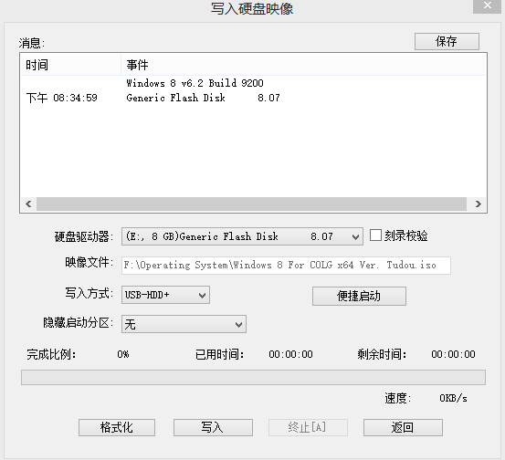 确定你的U盘,点写入。刚开始程序会无响应,别管,过会就开始写入了。
