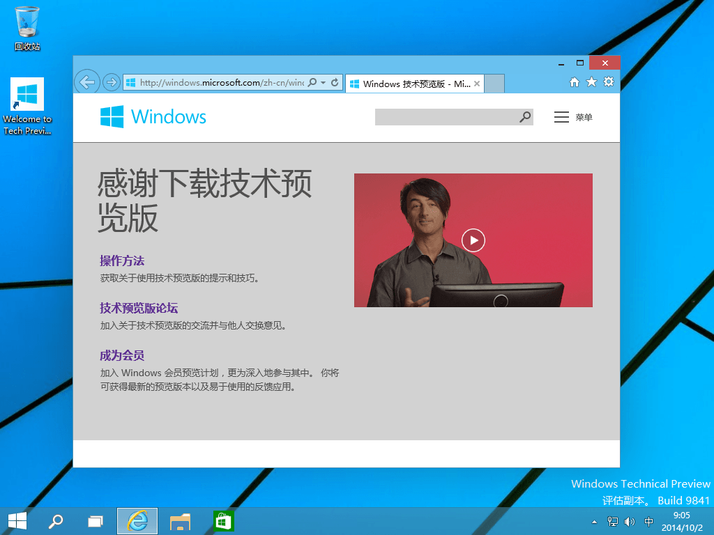 安装完成后进入桌面,那个Welcome to Tech Previ..的图标只是一个网页链接。